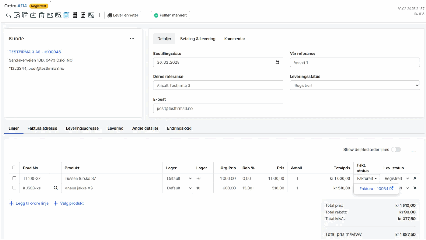 Dersom du bruker skybasert regnskap fra DNB Regnskap, Sparebank1 Regnskap eller Eika Regnskap, kan du nå klikke direkte på ordrenummeret i nettbutikken og åpne både ordre og faktura i regnskapssystemet. Kundenummeret vises også på ordren.