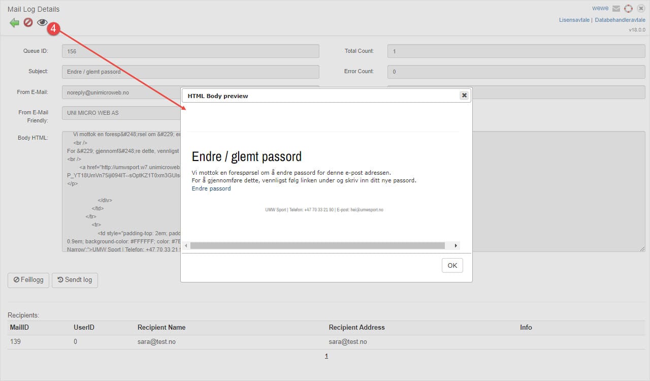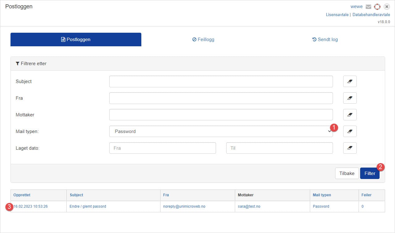 I E-post loggen kan man lese utsendte e-poster. Først, finn e-posten du ønsker å lese. I vårt eksempel vet vi at sara@test.no skal ha fått en "Endre / glemt passord" - mail og vi ønsker å finne denne.
