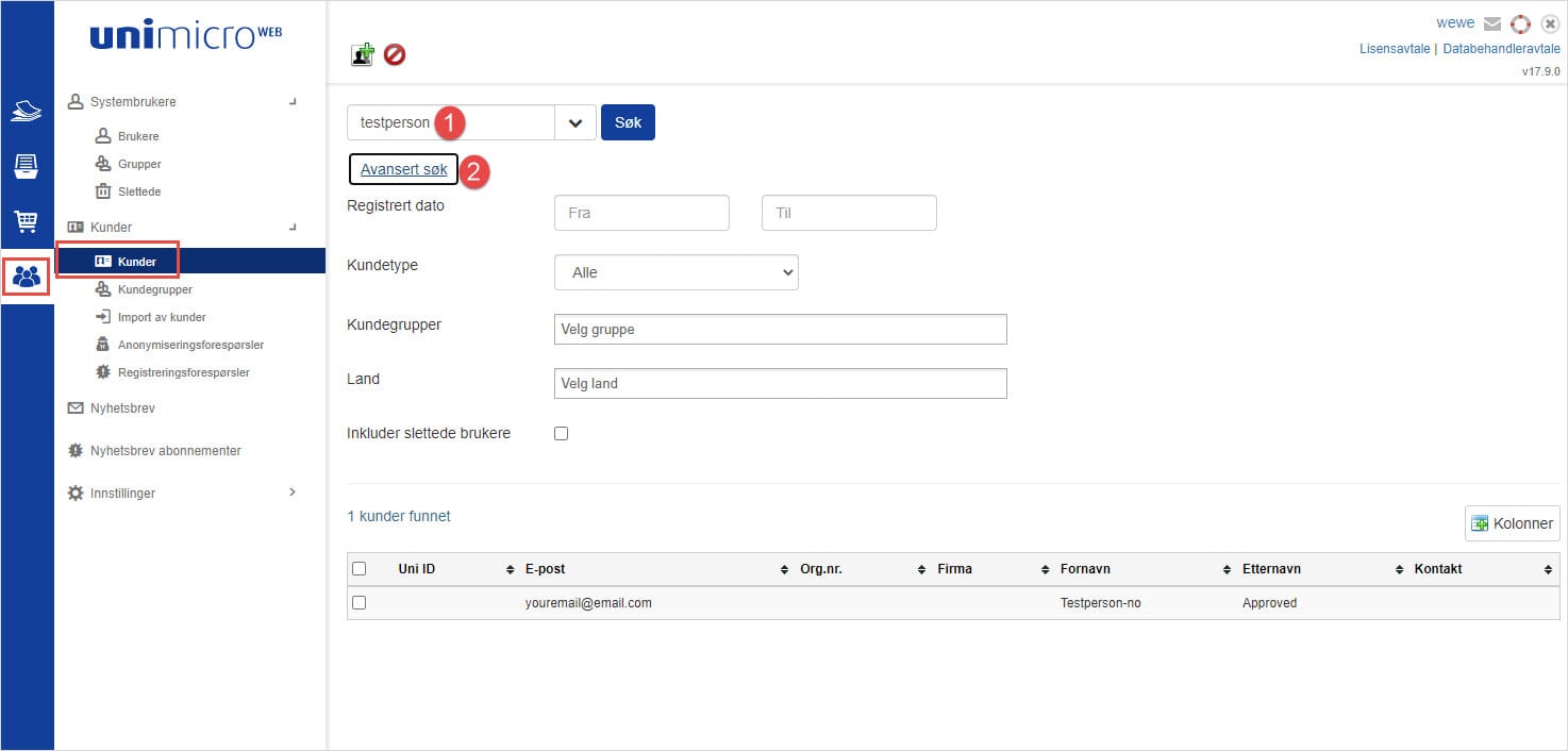 - Avansert søk kan brukes dersom du ønsker å spisse søket og eksempelvis se alle kundene fra et spesifikt land, kundegruppe eller kunder som har registrert seg innen et gitt tidsrom.