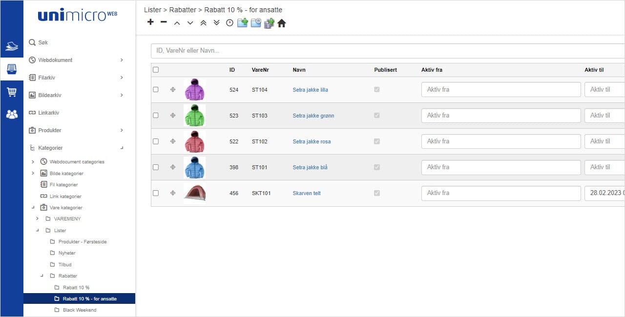 I nettbutikken kan rabatter opprettes på ulikt vis, vår anbefaling er å opprette rabattlister / kategorier for rabatter. Rabatt-lister er enkel og effektiv å jobbe med og de gir en god oversikt over hvilke varer som er rabatterte i nettbutikken. Rabattlister kan også gjelde en spesifikk kundegruppe eller kunde. Se eksempelvis rabattlisten "Rabatt 10% - ansatt" under: