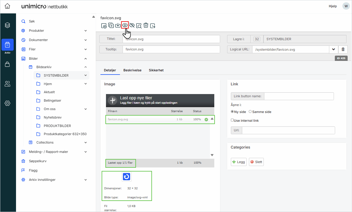 For at faviconet skal fungere, må du laste det opp i nettbutikkens bildearkiv, i mappen SYSTEMBILDER. Nettbutikksystemet er satt opp til å hente ikonfilen herfra, og bruker den deretter på nettadressen og i nettleseren. Det betyr at du slipper å gjøre noe med kode eller innstillinger – systemet gjør jobben så snart bildet ligger på riktig sted.