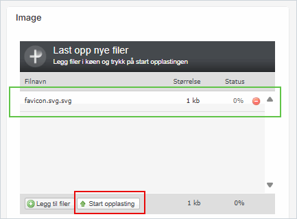 Om du la til feil bilde kan du klikke på Legg til filer igjen, systemet tillater kun et Flavicon, så bildet byttes automatisk ut.