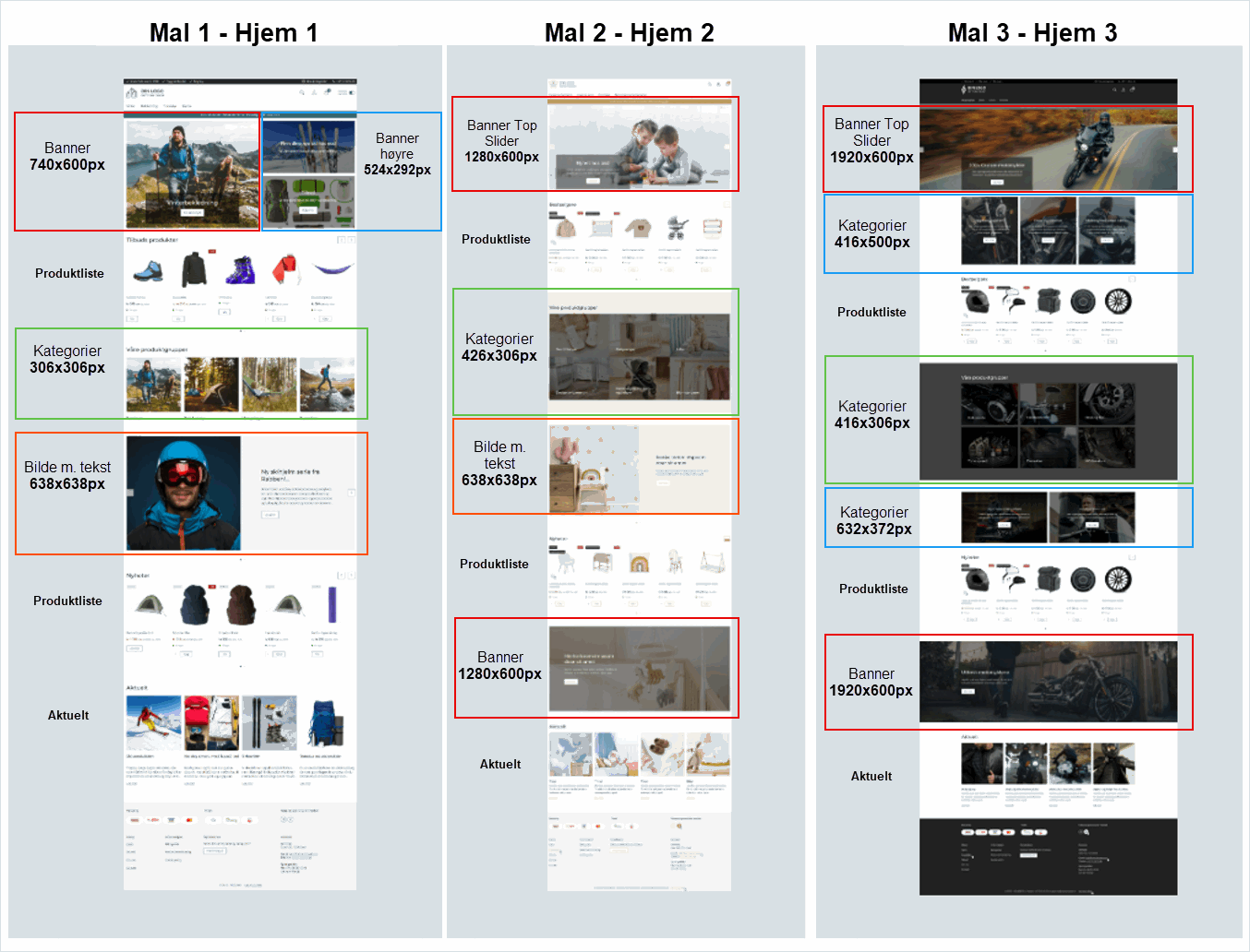 Hver mappe viser de tilgjengelige bildeseksjonene og deres anbefalte bildestørrelser: Banner 1920x600px