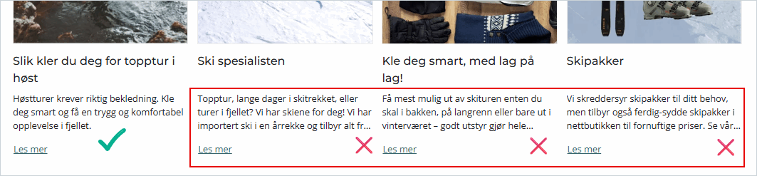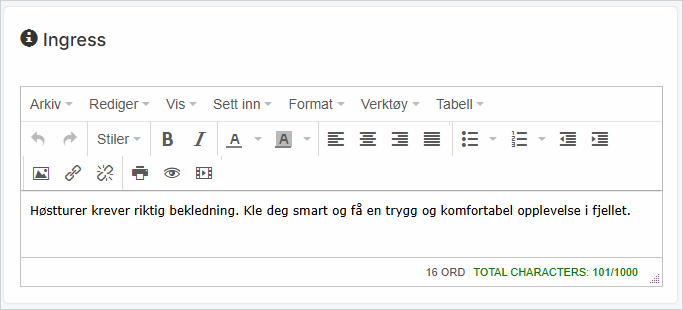 Hold ingressen rundt 100 tegn. Lengre tekst kuttes automatisk med "...", og det kan se uprofesjonelt ut.