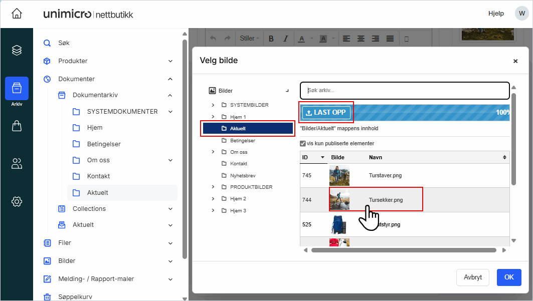 4. Om du laster opp: I vinduet som åpnes, velger du bildet fra datamaskinen din og klikker Åpne. Bildet lastes da opp og vises i mappen Aktuelt i nettbutikken.