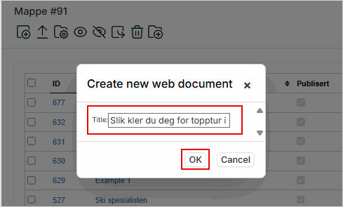 4. I boksen Create new web document, skriv inn navn på artikkelen Slik kler du deg for topptur i høst