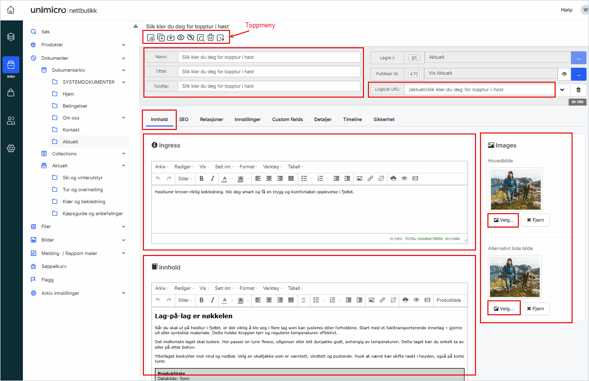 3. Under fanen Innhold legger du inn selve artikkelteksten. Her fyller du først ut ingress – en kort introduksjon som vises på forsiden og i artikkellister. Deretter skriver du hovedinnholdet, og kan legge til bilder, videoer og eventuelt produktlister.