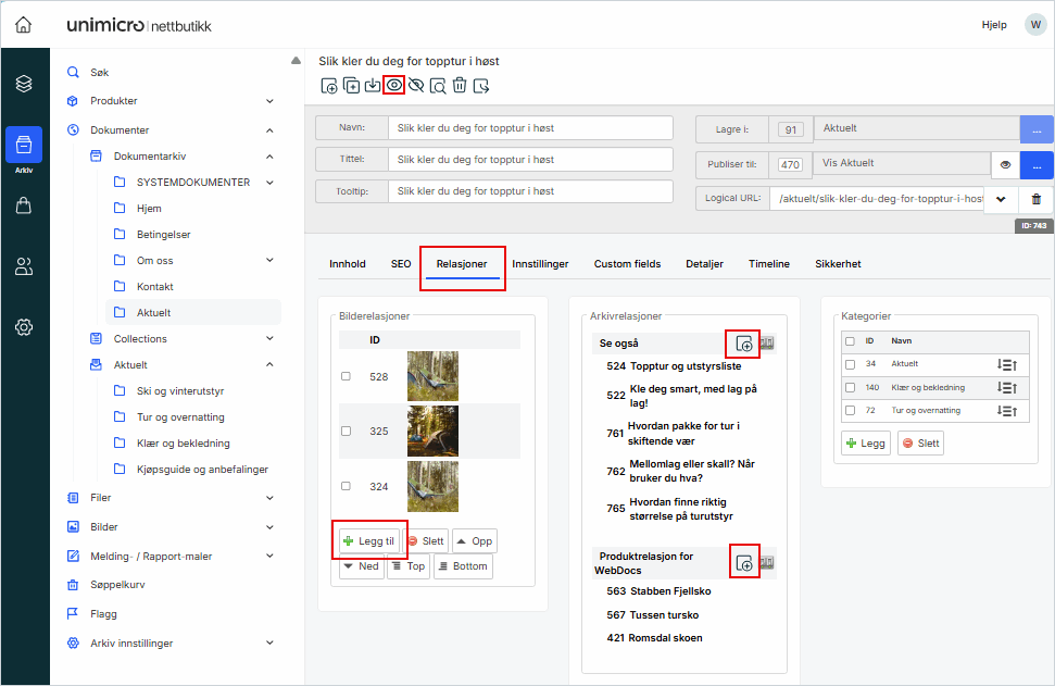 2. Bilderelasjoner:  Klikk på Legg til for å legge inn flere bilder fra bildearkivet