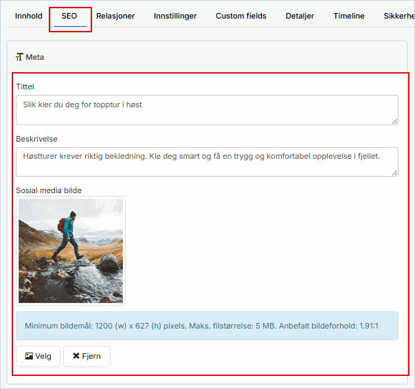 4. Sosiale medier-bilde (valgfritt): Hvis du legger til et bilde her, brukes det når artikkelen deles som lenke.