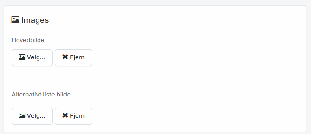 4. I feltet Images velger du et hovedbilde som vises øverst i artikkelen og i oversiktene. Om du ønsker, kan du legge til et eget listebilde som kun brukes i oversikter.