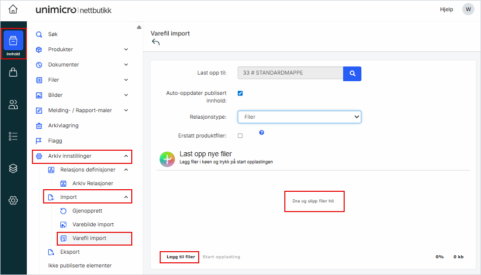 For at systemet skal koble PDF-filen til riktig produkt automatisk, må filnavnet være identisk med produktnummeret i nettbutikken. Hvis filnavnet ikke stemmer nøyaktig, blir filen avvist i importen og vil ikke knyttes til et produkt.