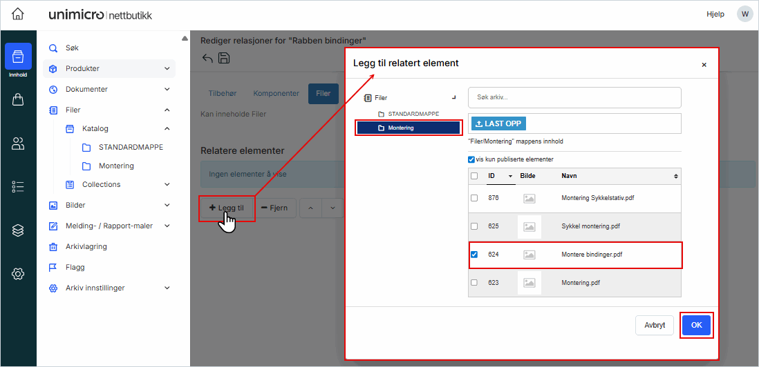 1. I vinduet Legg til relatert element, velg mappen Montering
