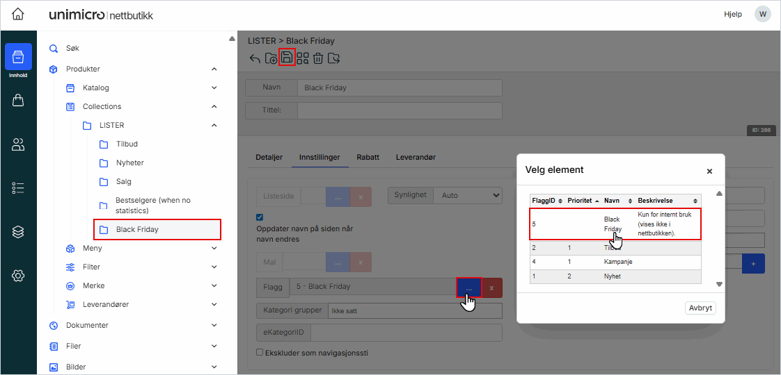 Her vil da alle produkt som er lagt til i denne listen bare vise Black Friday flagg