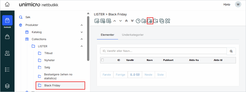 1. Gå til Innhold i venstremenyen og klikk på Produkter → Collections → LISTER