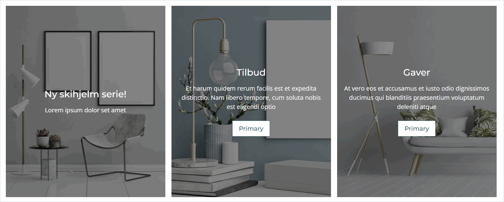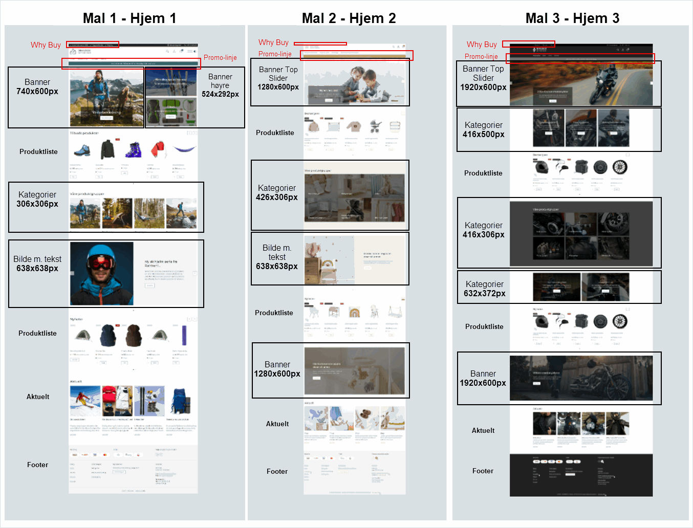 Avhengig av hvilken designmal nettbutikken din bruker – Hjem 1, Hjem 2 eller Hjem 3 – kan plasseringen og utformingen av seksjonene variere. Innholdet kan også styres med tidsplanlegging, slik at kampanjer og budskap vises på spesifikke tidspunkt.
