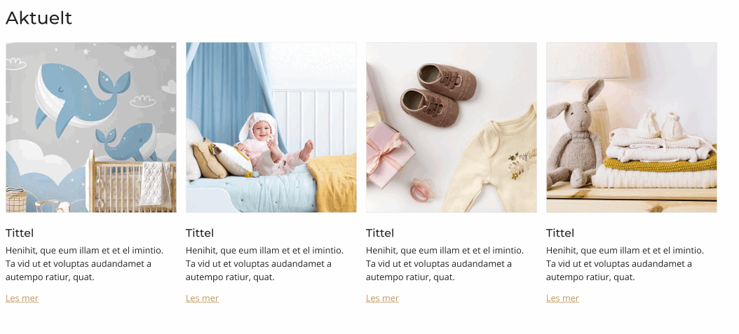 Del nyhetsartikler, blogginnlegg eller oppdateringer om hva som skjer i nettbutikken eller bransjen. Dette gjør det enkelt å holde kundene oppdatert, inspirere dem med nytt innhold og vise at nettbutikken din er aktiv og levende. For å Opprett nytt dokument for Aktuelt-artikkel eller redigere artikler i Aktuelt, går du til Dokumenter → Aktuelt.