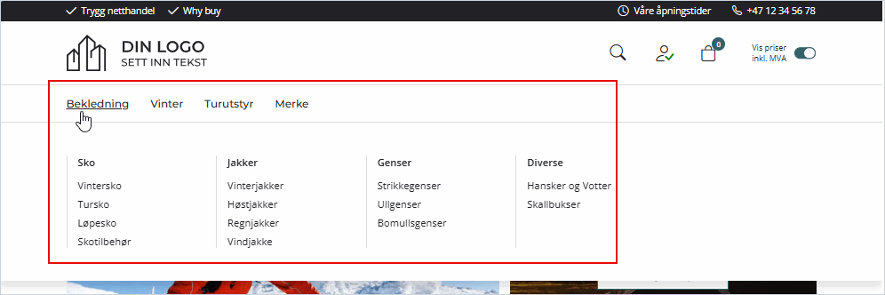 Menyen fungerer som hovednavigasjon i nettbutikken og viser til produktkategorier og merker. Du kan Opprette ny meny-kategori eller redigere eksisterende ved å gå til Produkter → Meny. For å legge til et nytt merke se Opprett kategorier for merker.