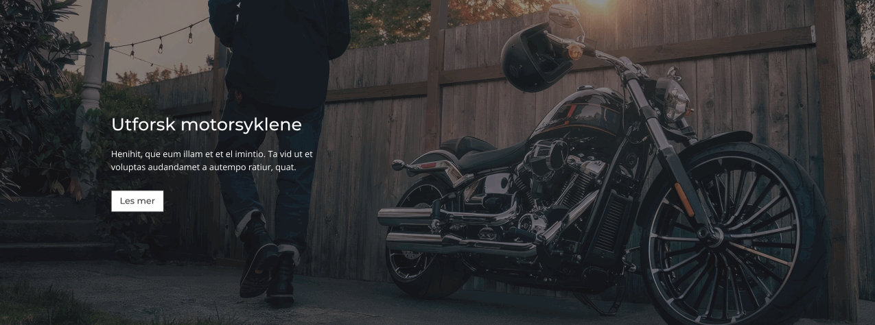 Bannerbildet er et stort bilde øverst på forsiden som fremhever et viktig budskap, en sesongkampanje eller utvalgte produkter. Dette bildet gir førsteinntrykket av nettbutikken og kan byttes ut eller oppdateres ved behov. I designmal Hjem 2 og Hjem 3 har forsiden en ekstra bannerseksjon lenger ned. Denne seksjonen fungerer på samme måte, men gir mulighet for et ekstra bilde med tekstfelt.