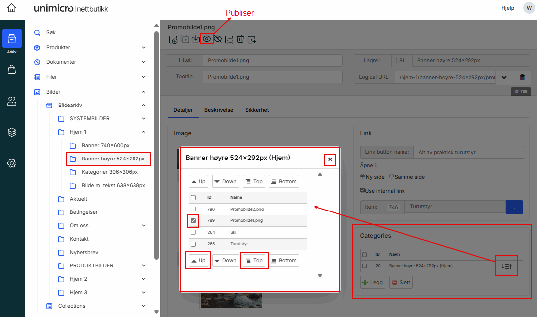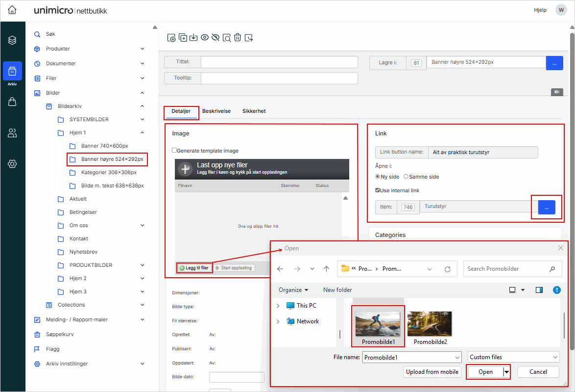 2. Klikk på Bilder → Bildearkiv → Hjem 1 → Banner høyre 524x292px