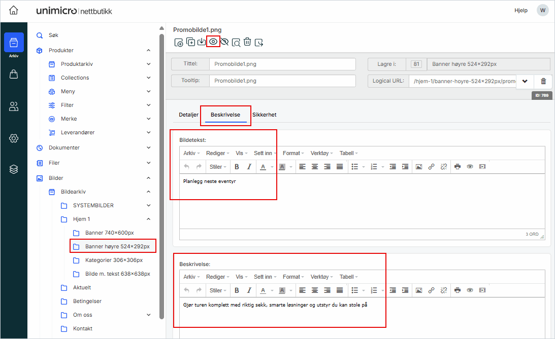 Du finner denne visningen under Arkiv→ Bilder → Collections → Hjem 1 → Banner høyre 524x292px (Hjem)