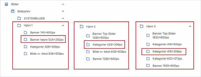 Du finner en mappe for hver seksjon under Bilder → Bildearkiv: Hjem 1, Hjem 2, Hjem 3