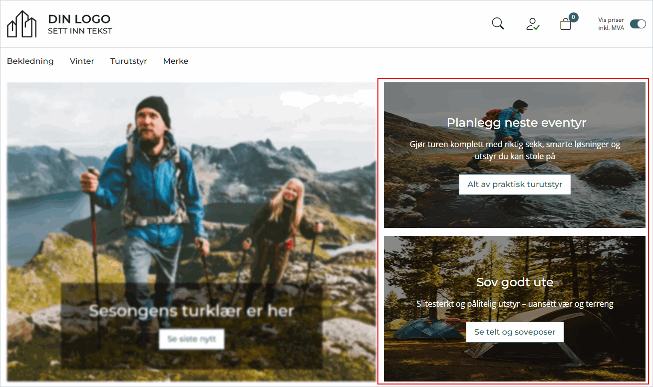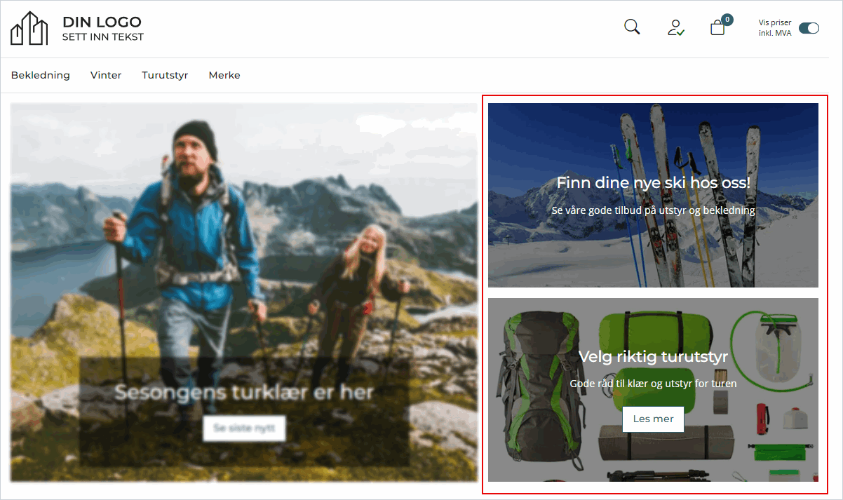 I eksempelet under bruker vi Mal 1 (Hjem 1) og legger til to nye bilder i samlingen Banner høyre 524x292px (Hjem).