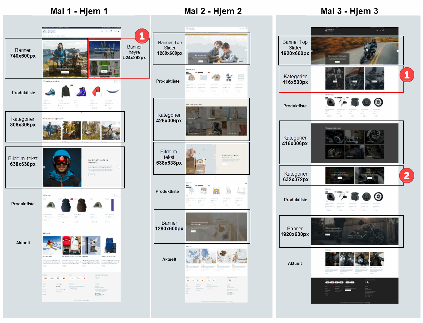 Hvilke promobilder som er tilgjengelige, og størrelsen på disse, bestemmes av hvilken designmal nettbutikken din er satt opp med: