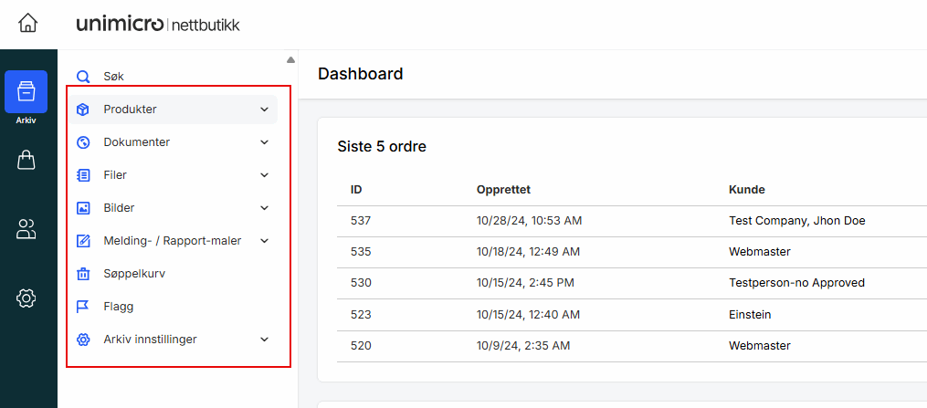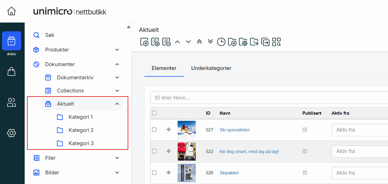 For å komme i gang med nettbutikken bør du først bli kjent i venstremenyens arkiv, hvor du håndterer alt innhold i nettbutikken.