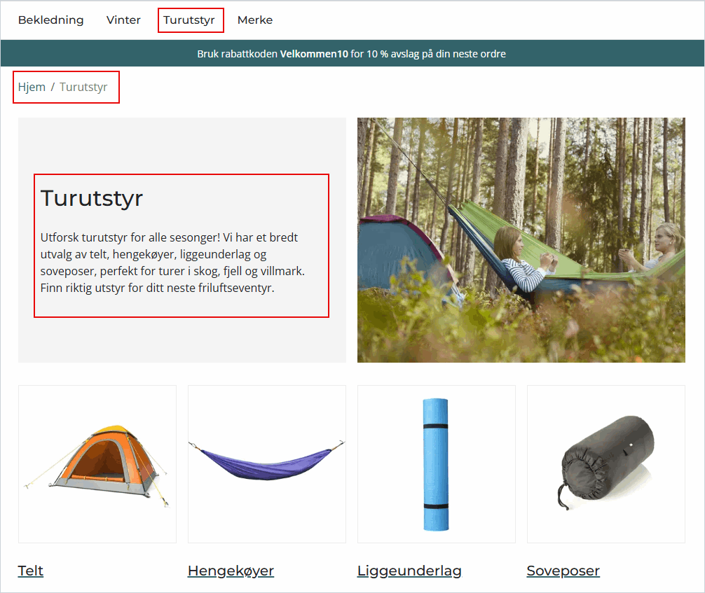 Nivå 1 – Hovedmenypunkt: Det øverste nivået, alltid synlig i toppmenyen. Eksempel: Bekledning, Vinter, Friluftsliv, Merke