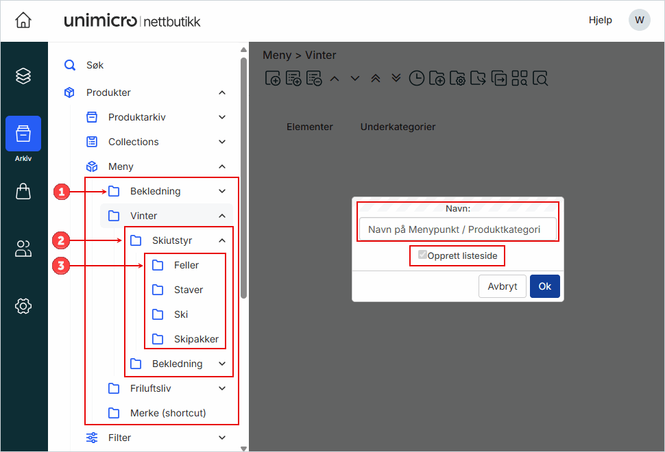 Legg underkategorier (nivå 2 og eventuelt nivå 3) under riktig menypunkt