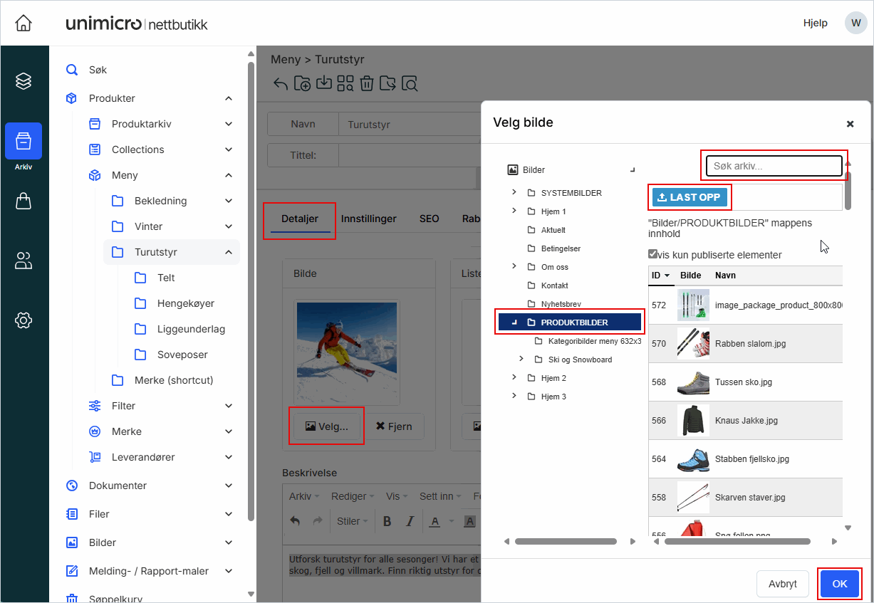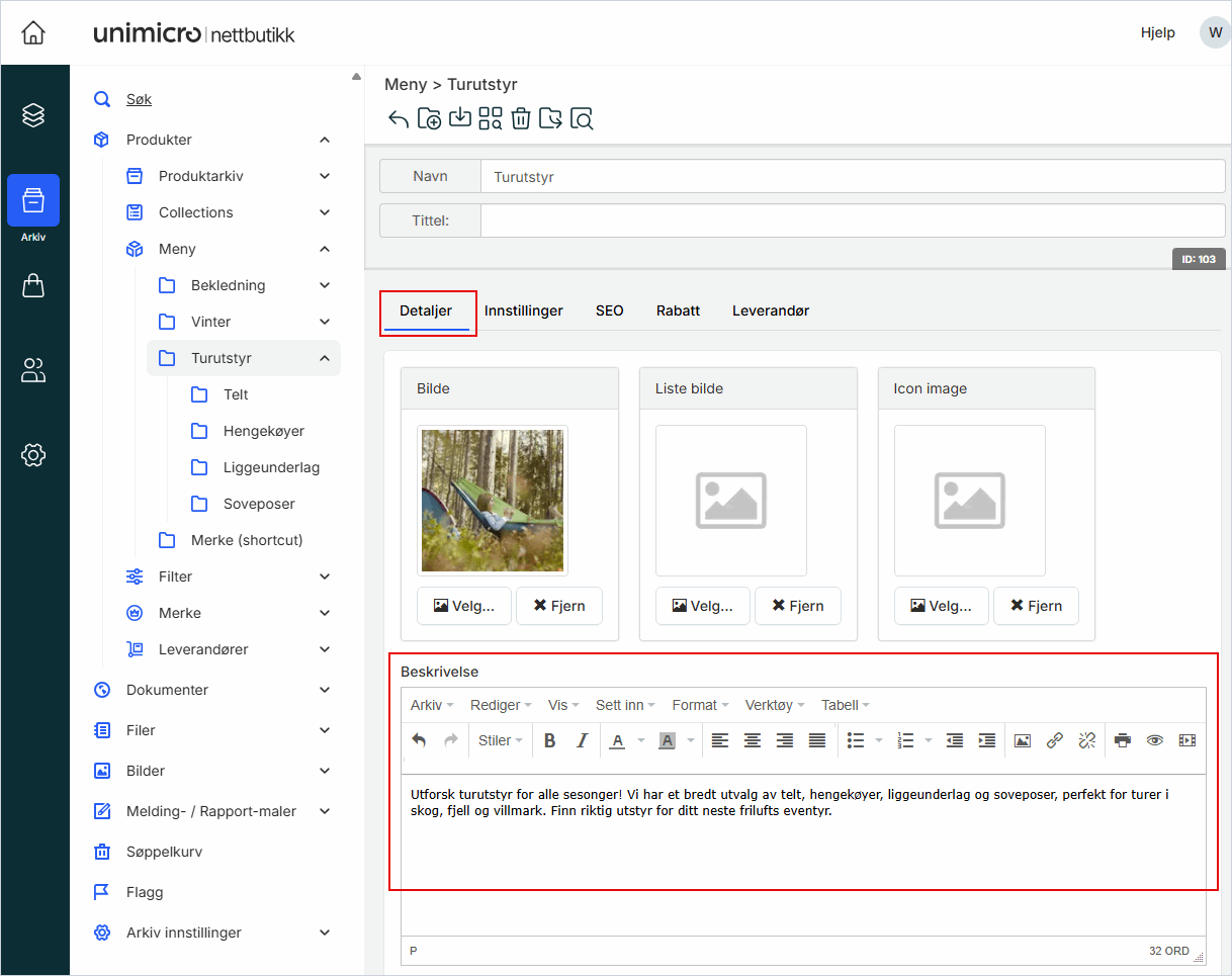 2. Du vil nå se oppdatert beskrivelse og bilde i arkivet, og endringene vises også i nettbutikken og ved deling i sosiale medier