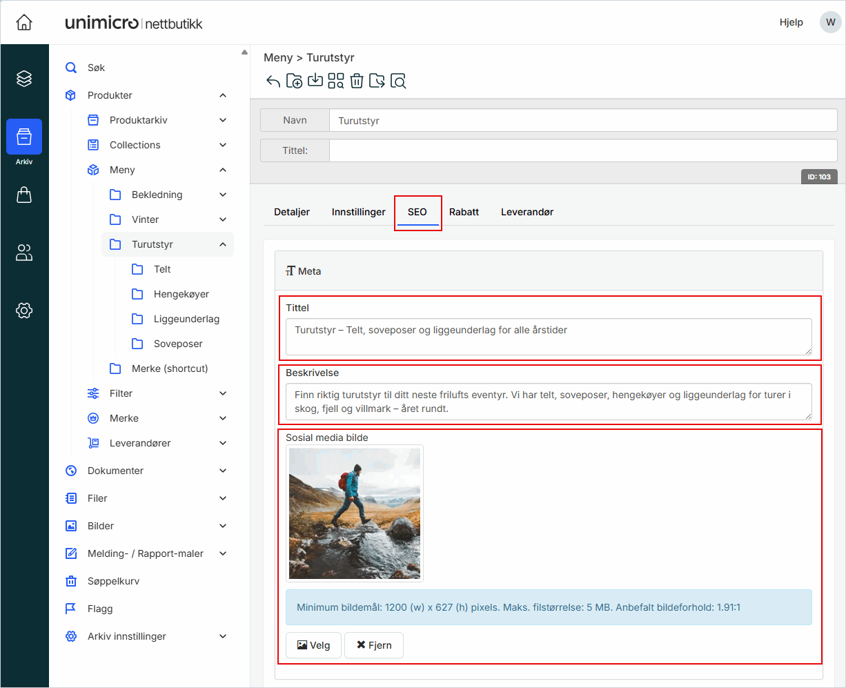 Fyll ut feltene under fanen SEO for å øke synligheten i søkemotorer.