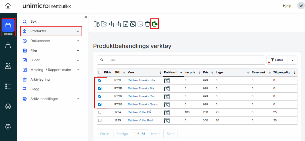 1. Sett hake ved hvert produkt du vil ta med i eksporten. Bruk haken øverst i listen for å markere alle produktene i visningen.