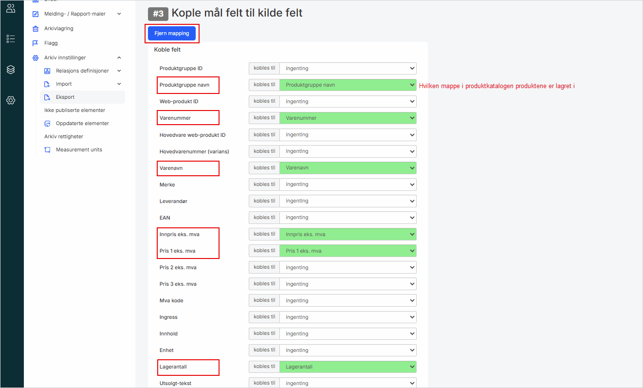 1. Klikk Fjern mapping for å fjerne alle automatisk koblede felter