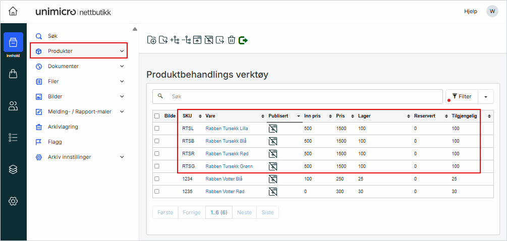1. Klikk på Produkter i venstremeny for å åpne Produktbehandlingsverktøyet
