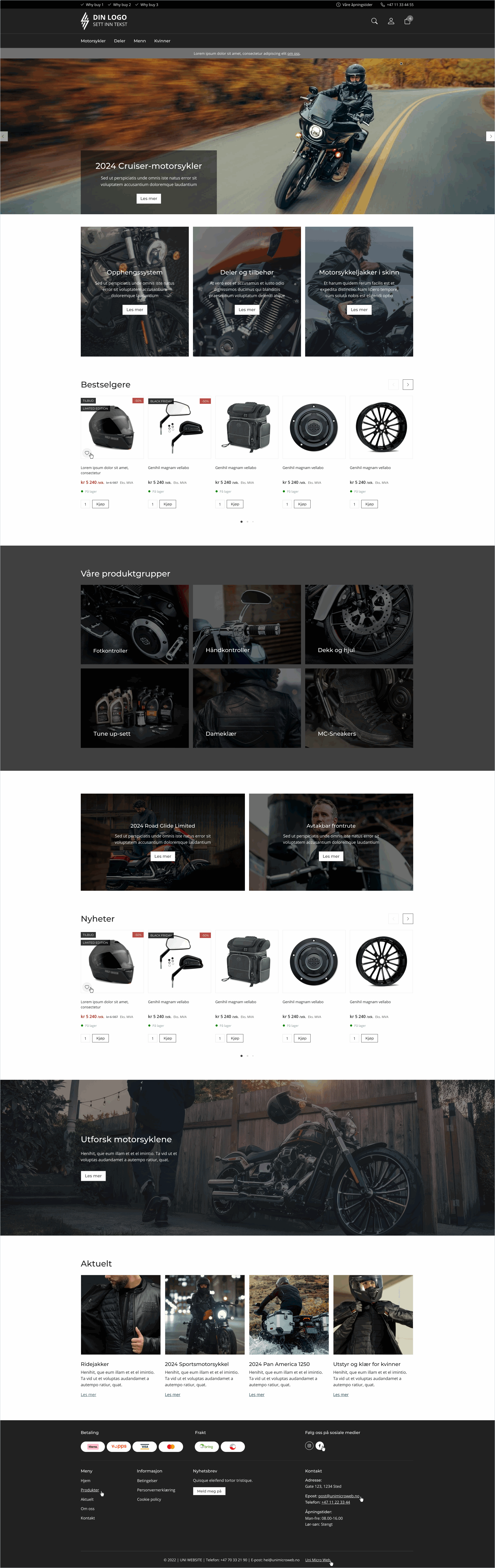 Stort bannerbilde øverst kombinert med flere store visuelle seksjoner nedover forsiden