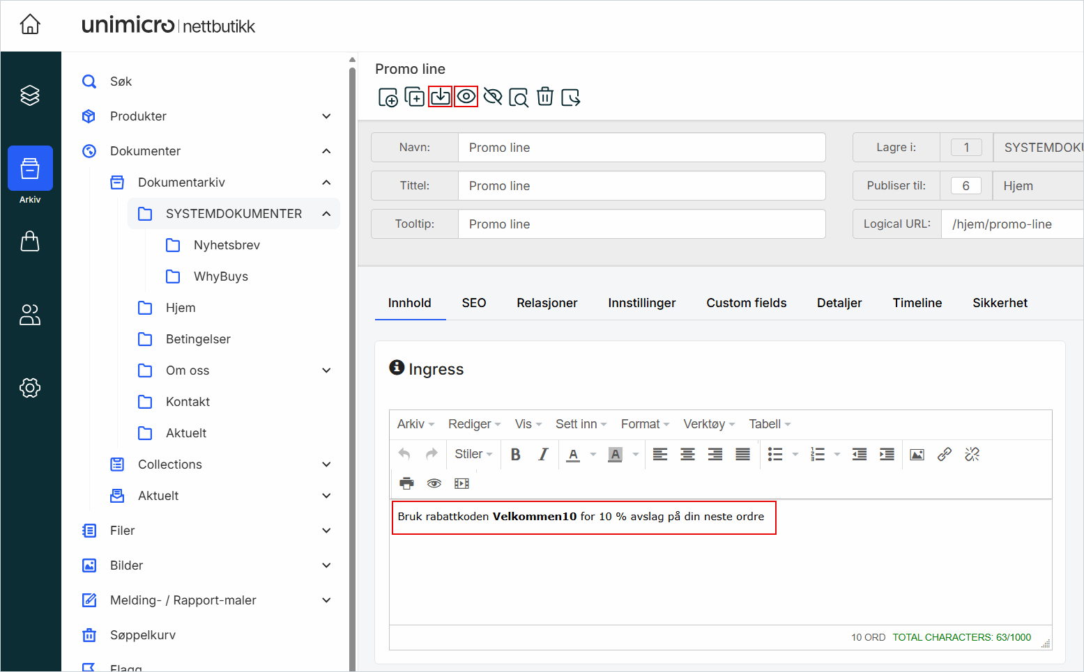 Eksempel: På bildet nedenfor ser du et eksempel på hvordan promo-tekstlinjen kan brukes til å vise en rabattkode. Den plasseres under produktmenyen og vises bare hvis du legger inn tekst.