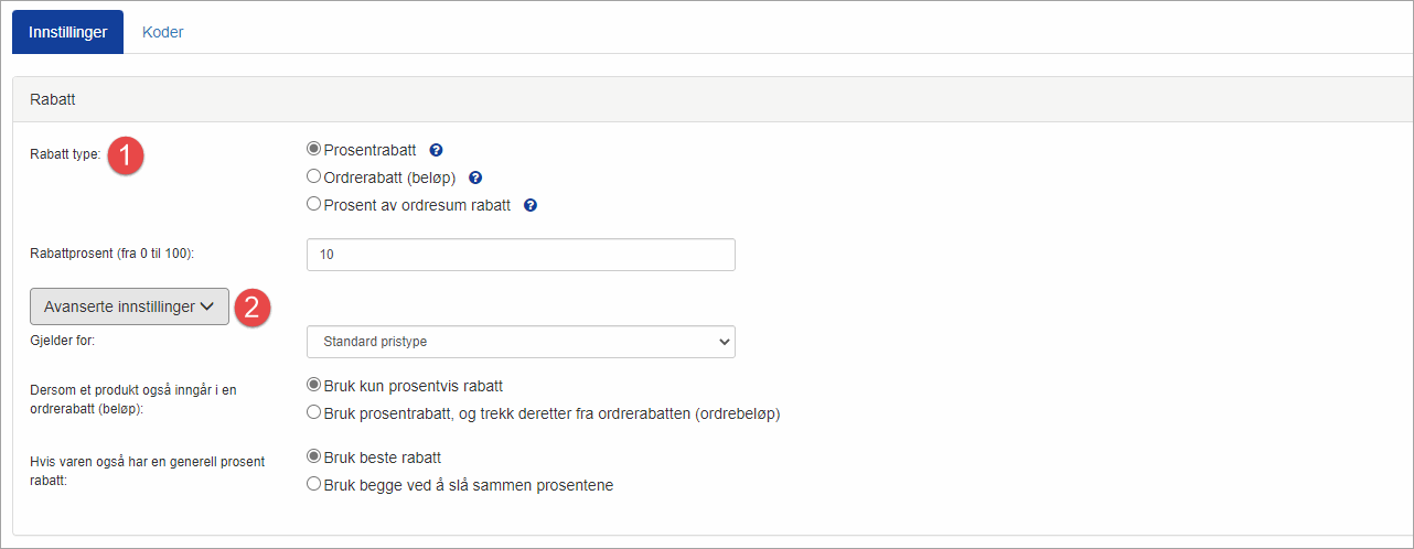 Når du lager en rabattkupong får du mulighet til å sette innstillinger og betingelser som gjeler for alle kodene som blir laget under den aktuelle rabattkupongen.