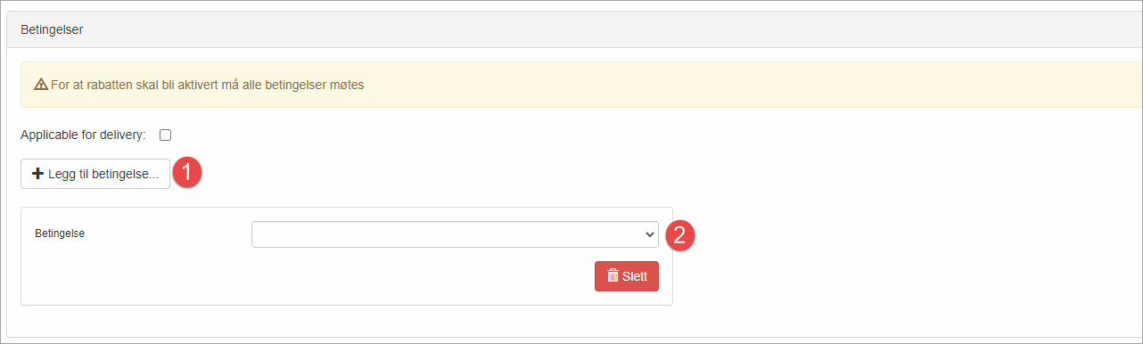 1. Her kan du legge inn en eller flere ulike betingelser som skal gjelde for rabattkoden.