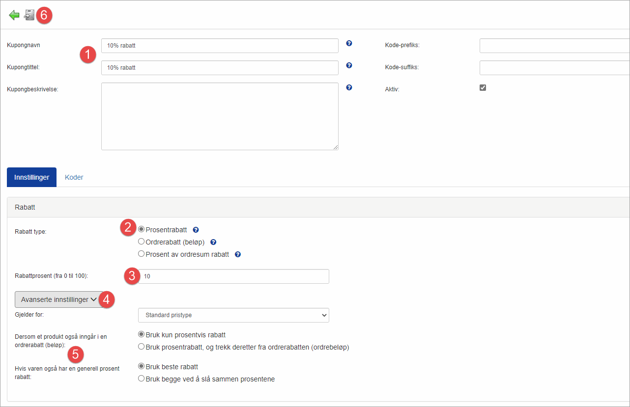 5. Her kan du ta stilling til om rabattkoden kan anvendes sammen med andre rabattkoder som gir ordreratter (beløp)