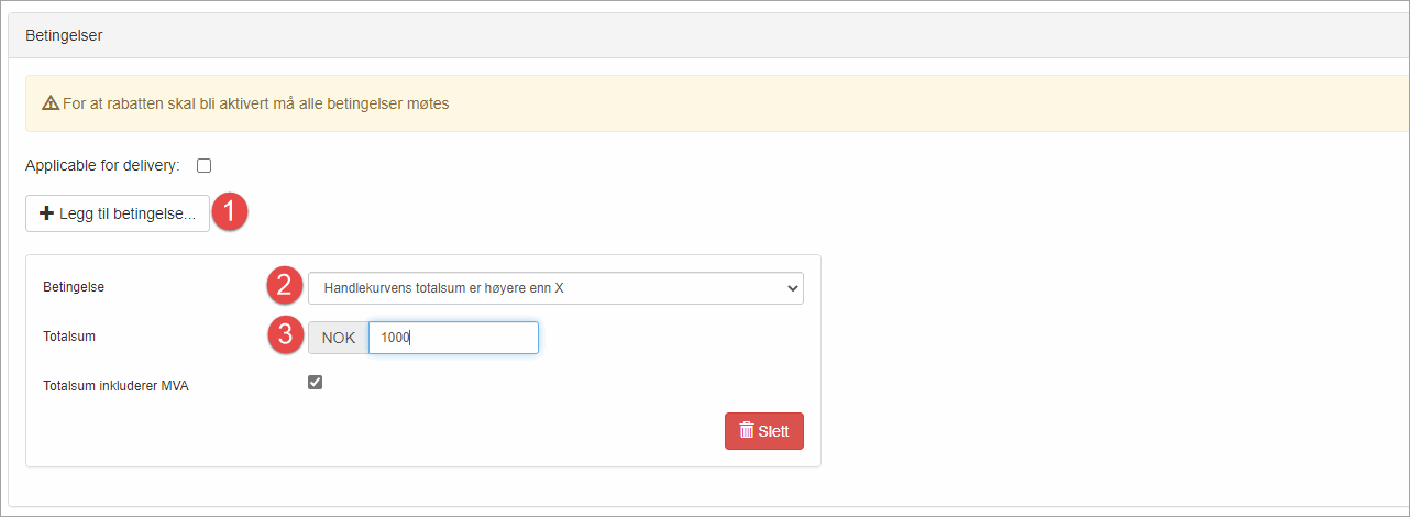 2. Velg betingelse "Handlekurvens totalsum er høyere enn X"