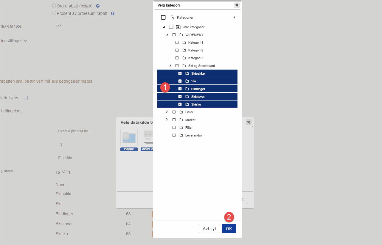 4. Trykk på "velg" for å bestemme hvilke varekategorier rabattkoden skal gjelde for