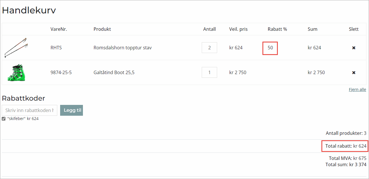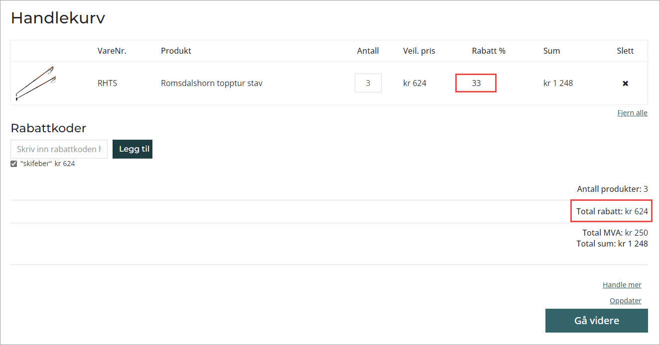 Her ser jeg at rabatten gir meg den tredje av valgt vare "gratis". Dersom det hadde vært tre ulike varer med ulik pris, hadde rabatten rammet den billigste varen (se eksempel under)