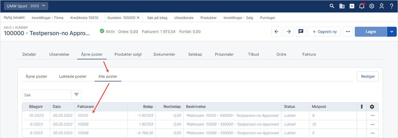 Inne på kundekonto, gå til fanen "Åpne poster" og "Alle poster" → her kan du se at kreditnota 10010 automatisk har blitt billagsført: