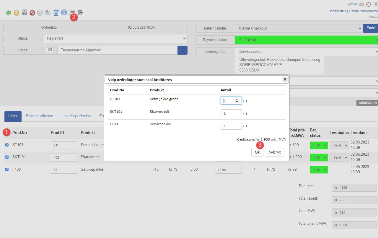 3. Her får du et kontrollspørsmål om merkede ordrelinjer skal krediteres og du kan evt. gjøre korrigeringer. Trykk tilslutt "Ok"