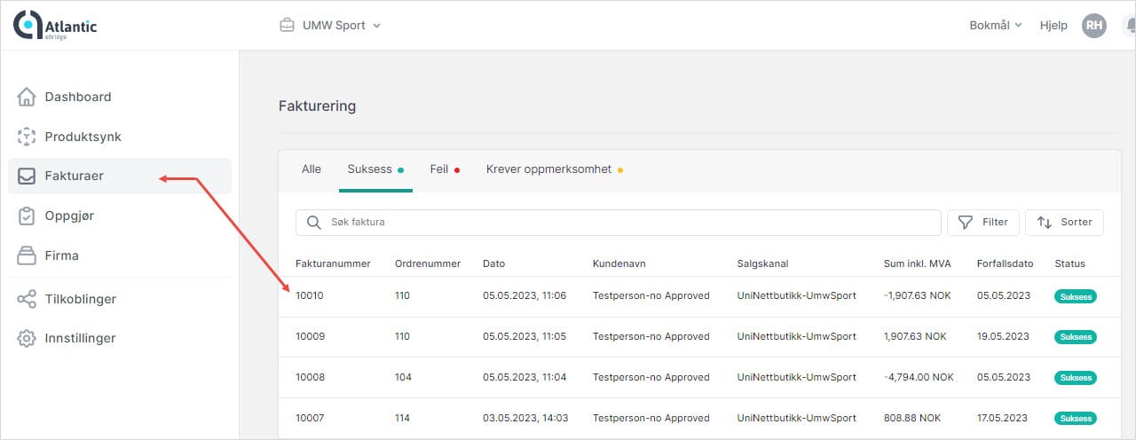 Kreditnota har fått fakturanummer 10010 og har status "Suksess":