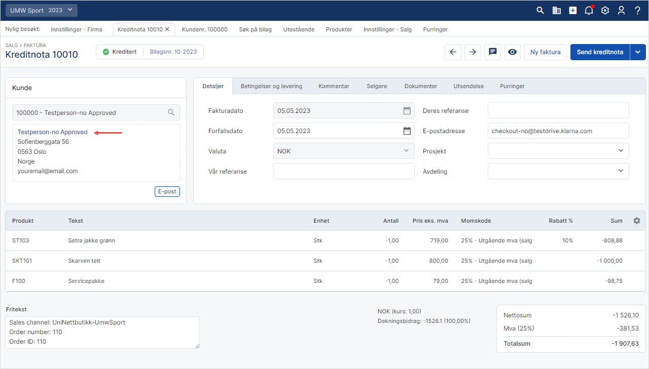 5. Ordrelinjer er også merket "Kreditert"