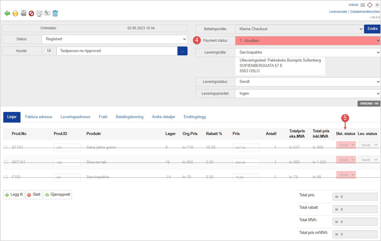 4. Webordre er nå kreditert og har fått betalingsstatus "Kreditert"