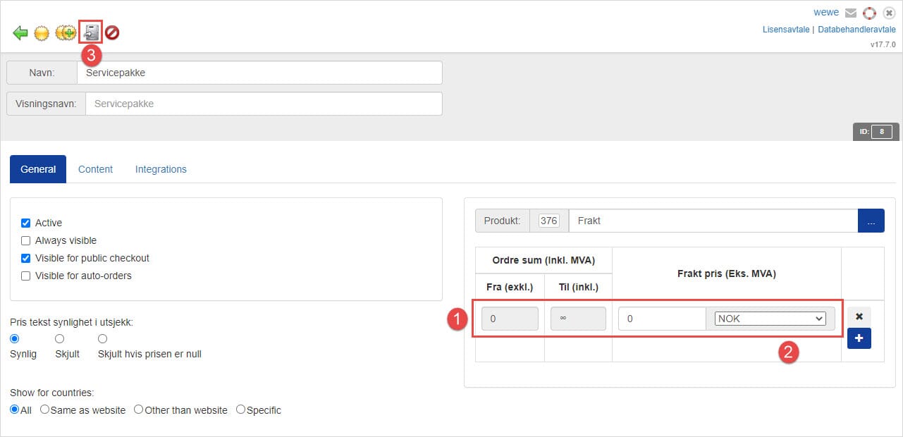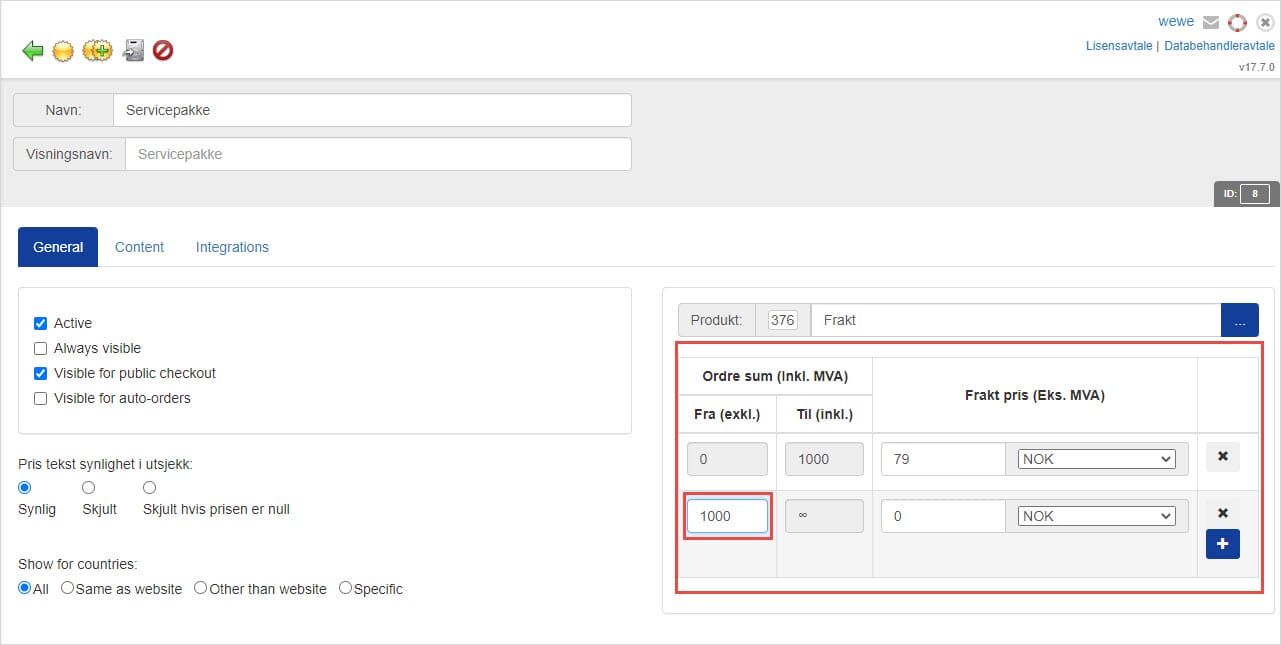 - Sett fra 0 til 0 på frakt pris
