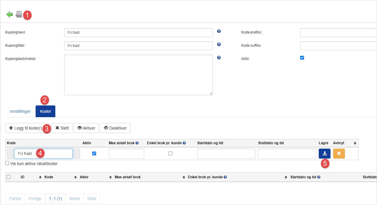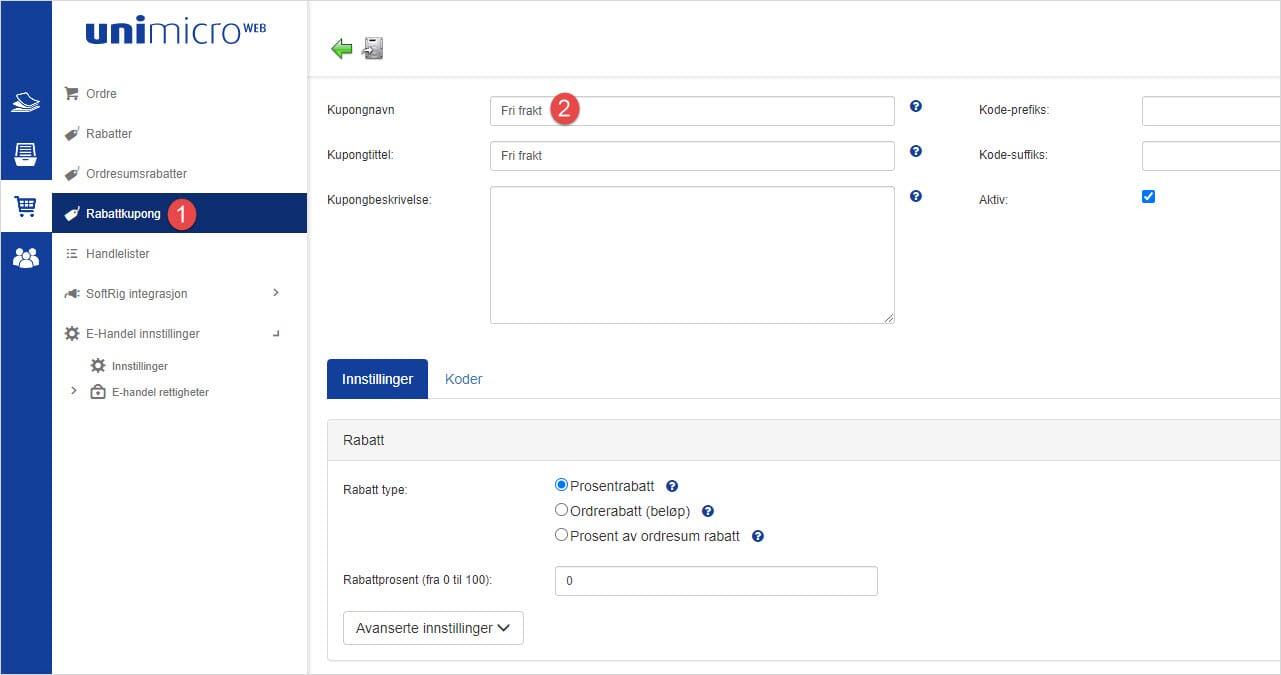 - Naviger til rabattkodemodulen og opprett en ny rabattkupong